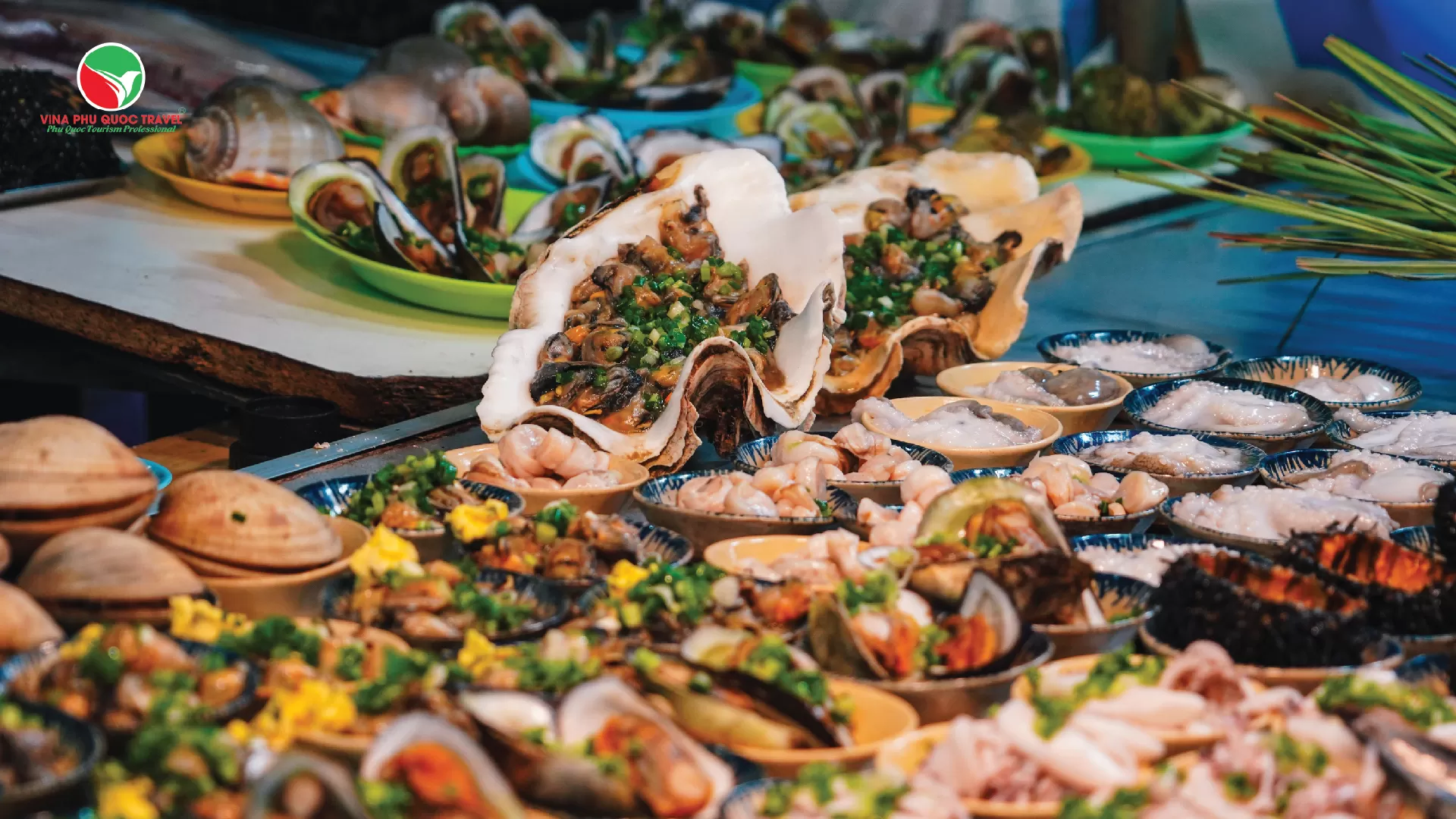 Các món: Ghẹ Hàm Ninh, tôm mũ ni, nhum biển nướng mỡ hành, cá mú hấp xì dầu.
