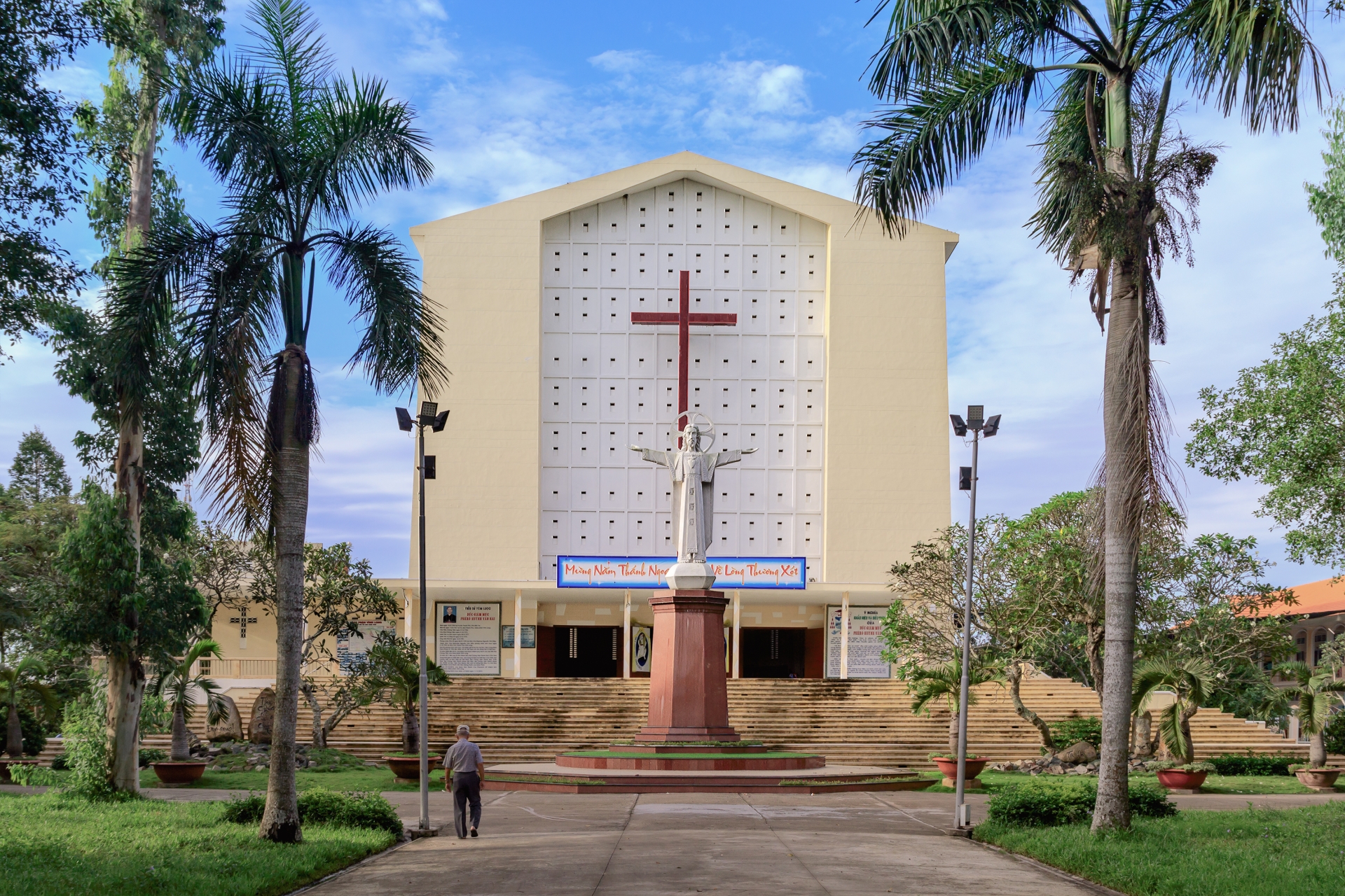 Mặt tiền: cửa vòm cong, tường sơn trắng ngà, đường nét giản dị nhưng trang nghiêm.